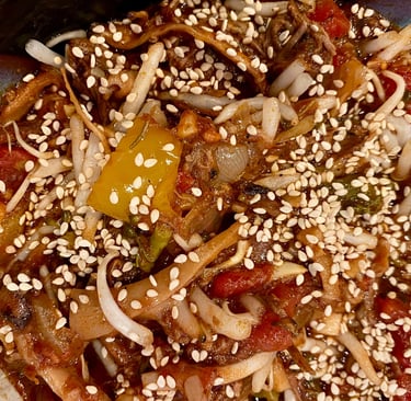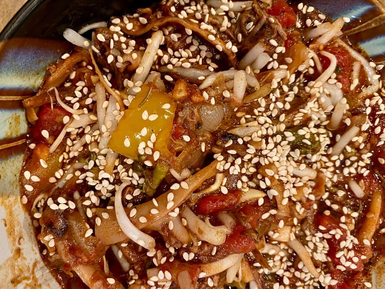 A fun twist on an American classic! This one is packed with umami, between the pulled oyster mushrooms, the beef round, coconut aminos, and the oyster sauce! Enjoy with fresh diced bean sprouts and sesame seeds.