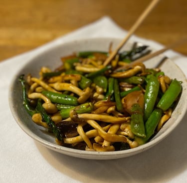 Deliciously textured stir fry featuring beech mushrooms which have a tendency to get nice and crunchy.