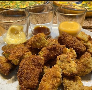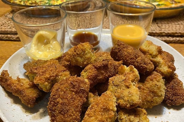 Vegan Option: Flour Seasoned with paprika, garlic, onion and turmeric powder mixed with water until smooth, save half of the dry flour mixture for a second coating