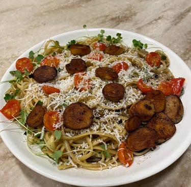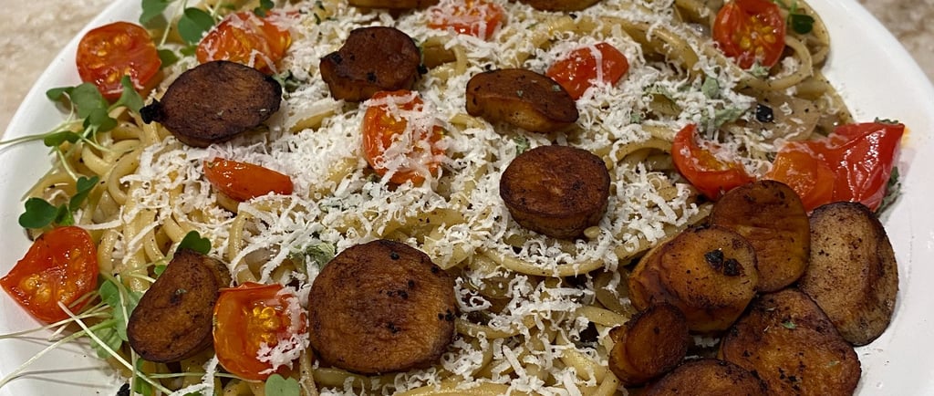 Beautifully caramelized King Oyster "scallops" or medallions served with a garlic white wine sauce over linguini.