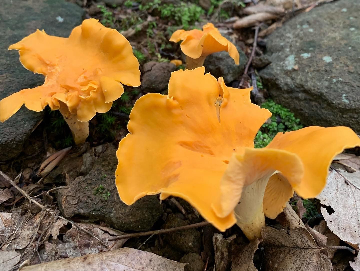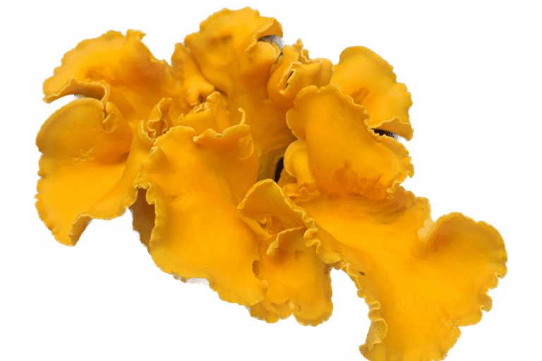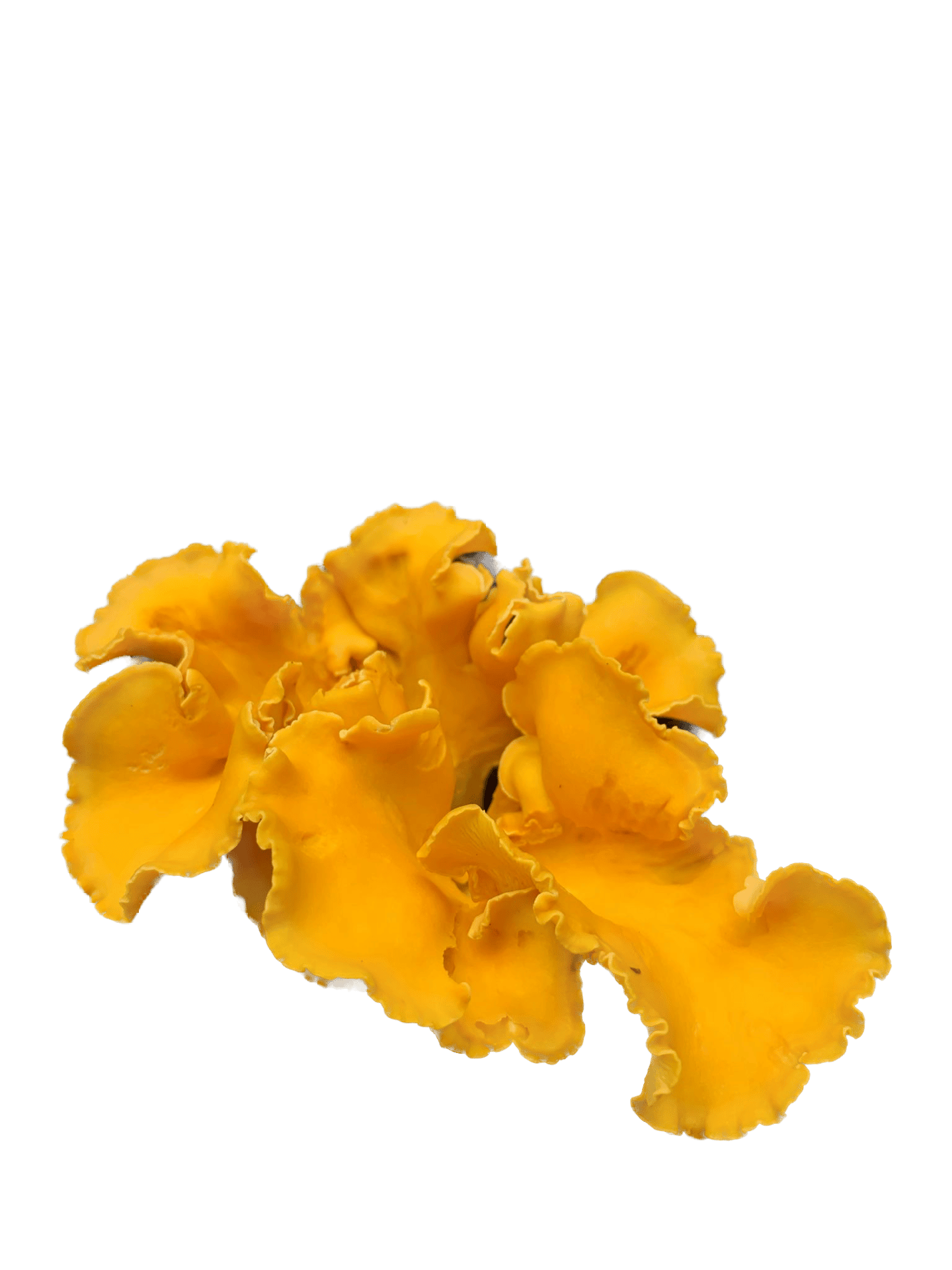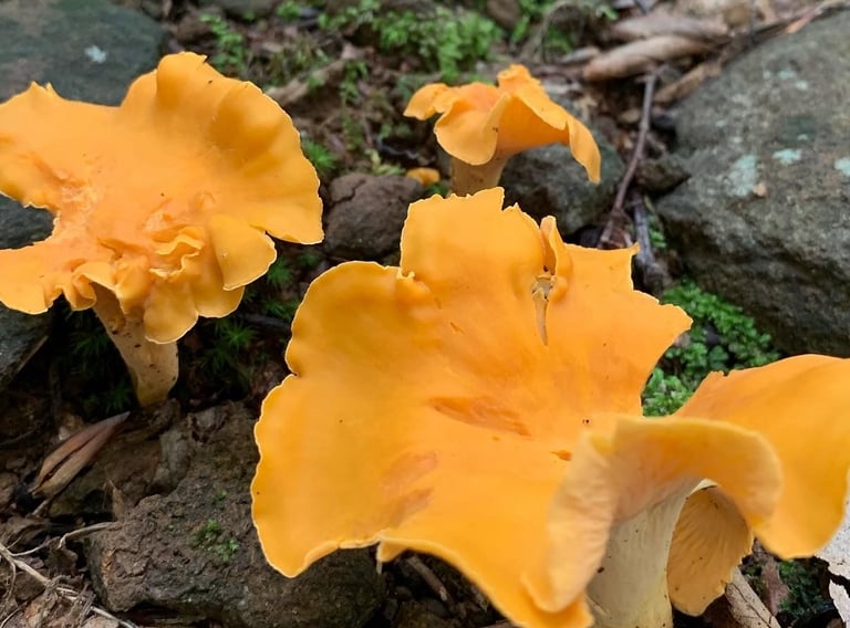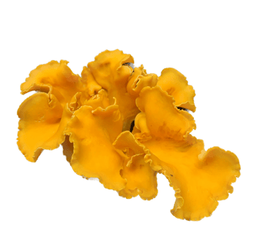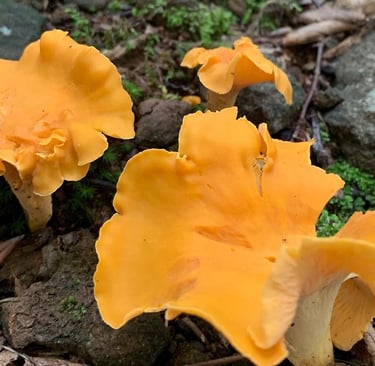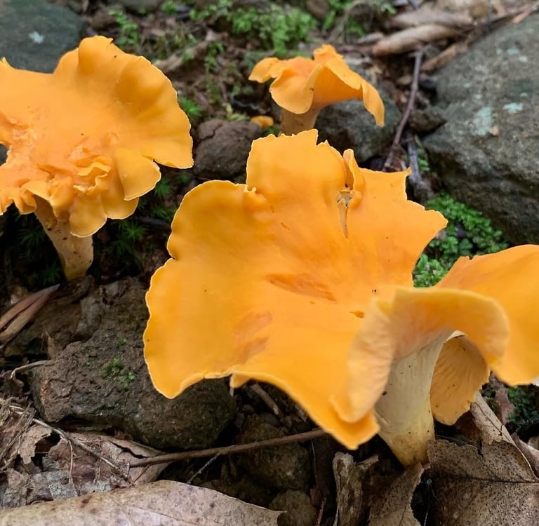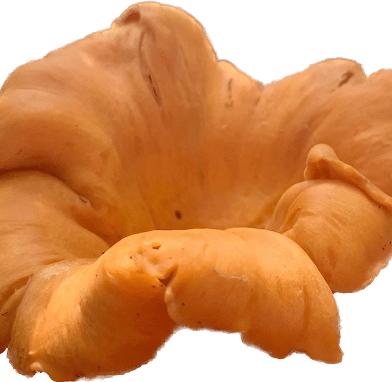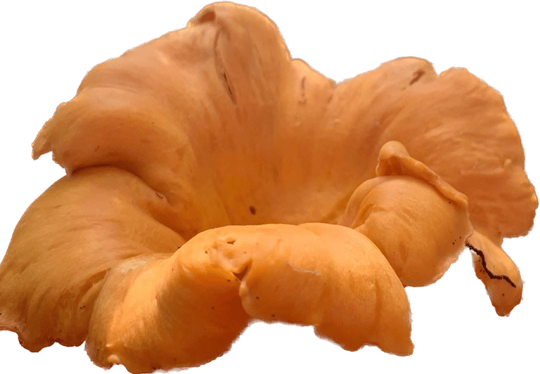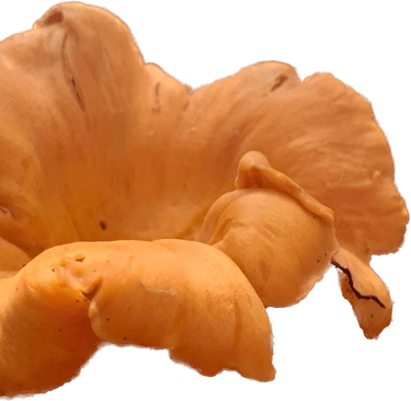 Bright orange to yellow in color and sometimes white. The two most distinctive features of the chanterelle are the mild fruity scent, resembling apricot, and the false gills and decurrent pattern. This means they do not have true gills but folded ridges that start at the wavy edges and extend down the stem.