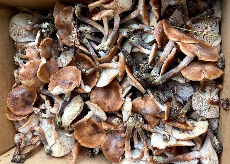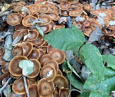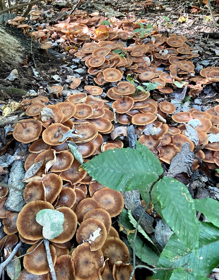 A. mellea grow an unusual black-stranded mycelium that parasitize and kill living hardwoods trees. The mycelium extends into the soil surrounding the tree where the mushrooms come up in the fall.