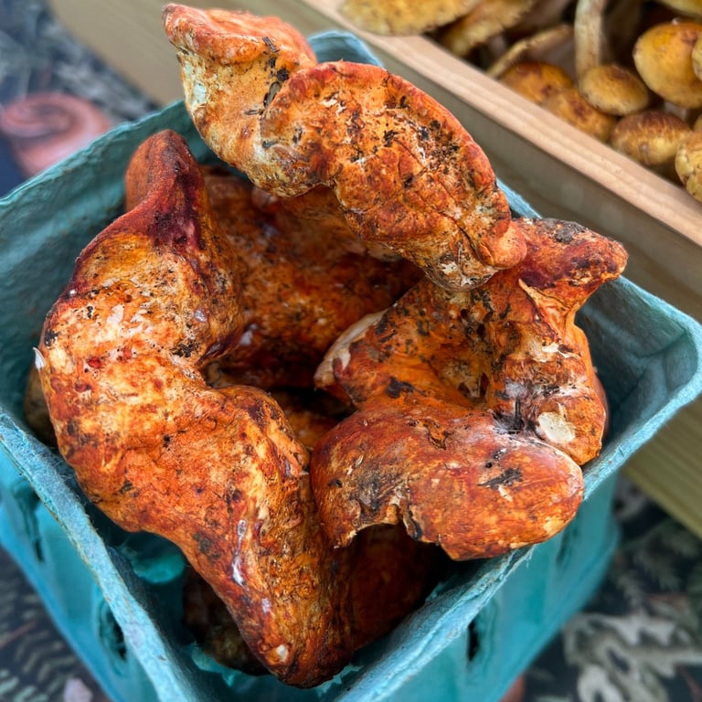 Lobster mushrooms are coined their name due to their lovely red color and surprisingly shellfish-like odor. The taste is closer to a mild white-fish than lobster (try lion's mane mushroom for a savory lobster like flavor).
