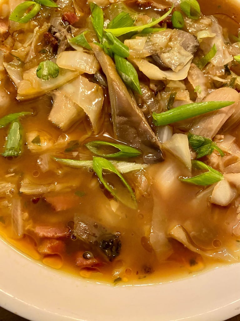 Roughly chop half a head of cabbage and add it to the soup. allow to simmer for 5 minutes.