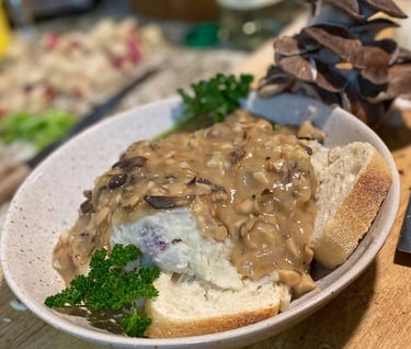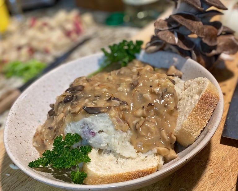 Reduce the heat to medium low and toss in the garlic. Stir to combine for 30 seconds, allowing it to become aromatic. Add the remaining 3 Tbsp butter. Once melted, add 3 Tbsp flour and mix until the mushrooms are fully coated in the roux.